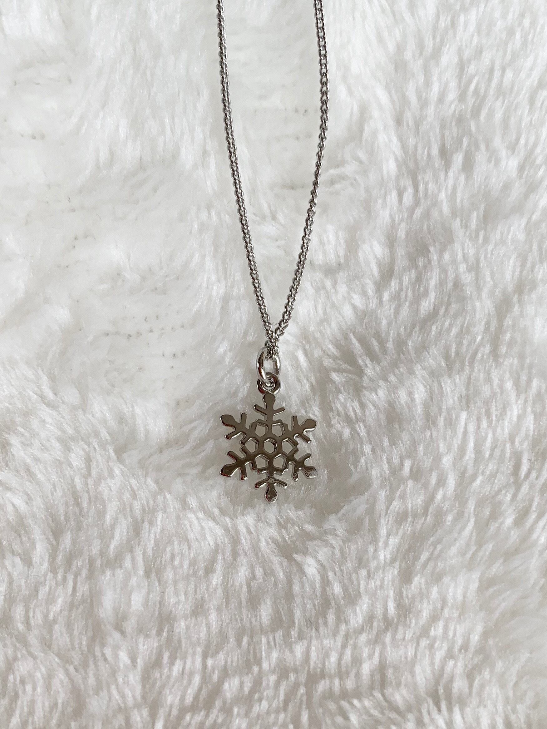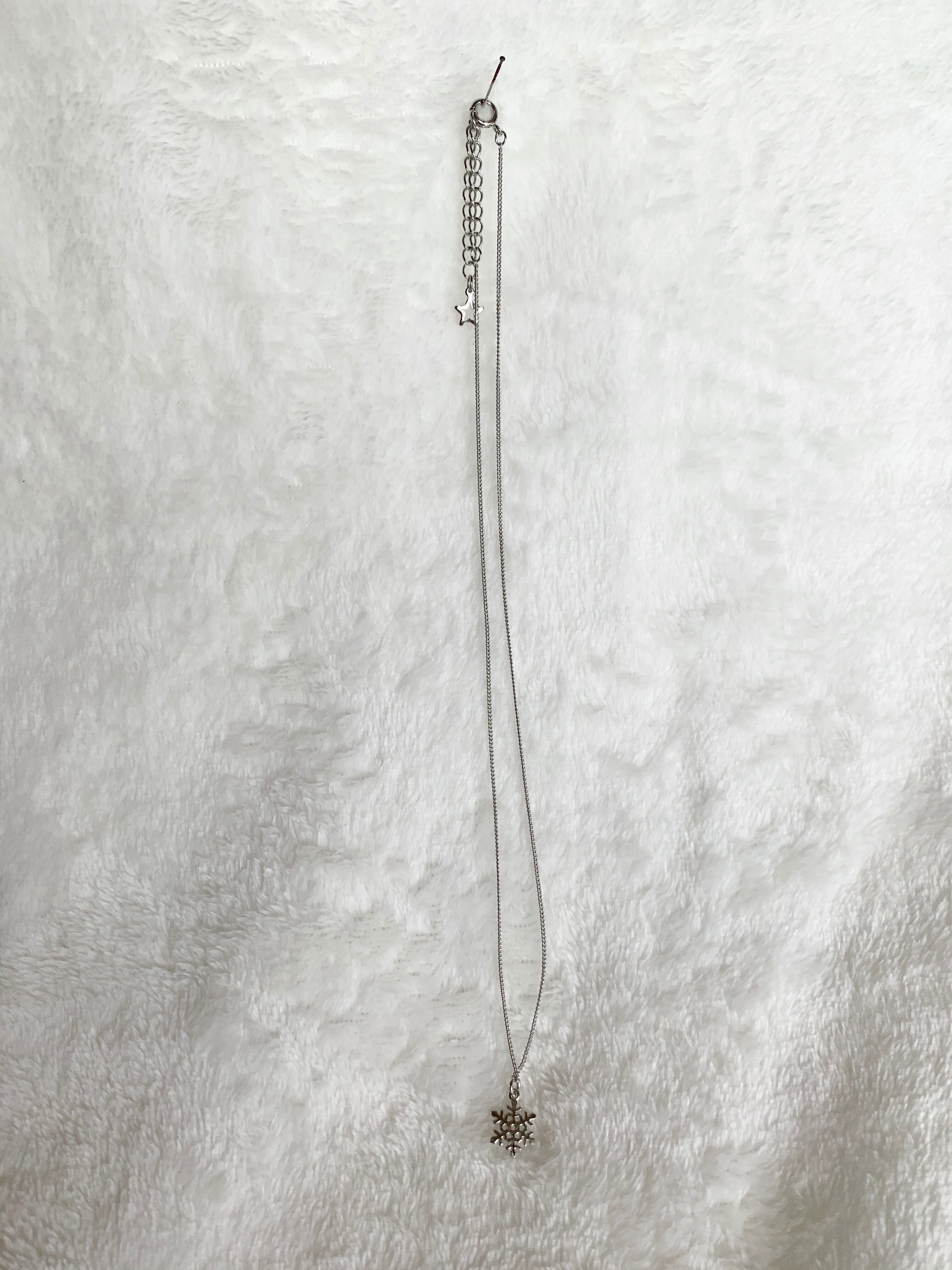 雪の結晶型のパーツを付けたネックレスです ネックレス部分 全長さ:約43cm 長さ調整部分:約5.5cm パーツ 約1cm 素材 メッキまたは真鍮・丹銅