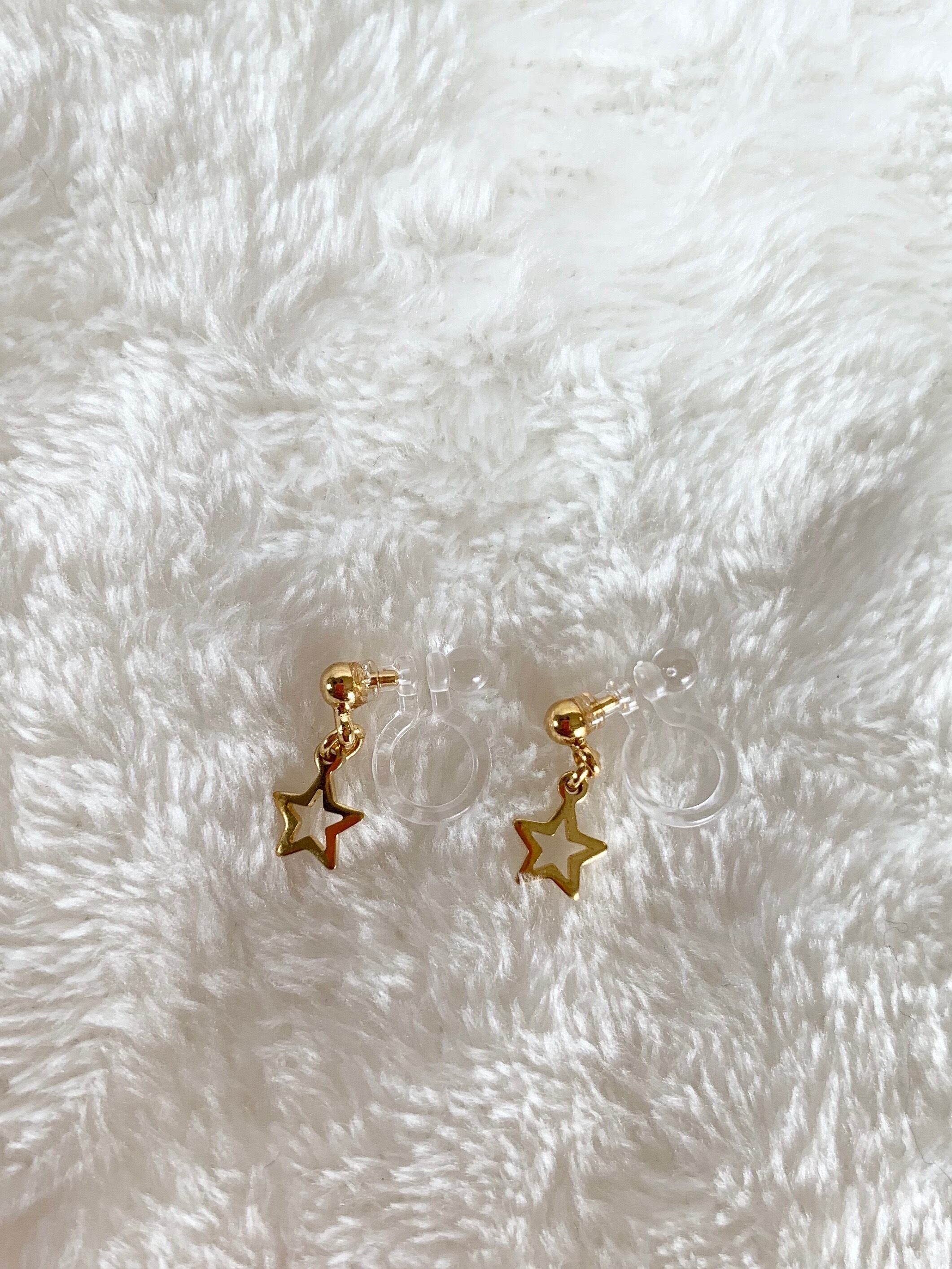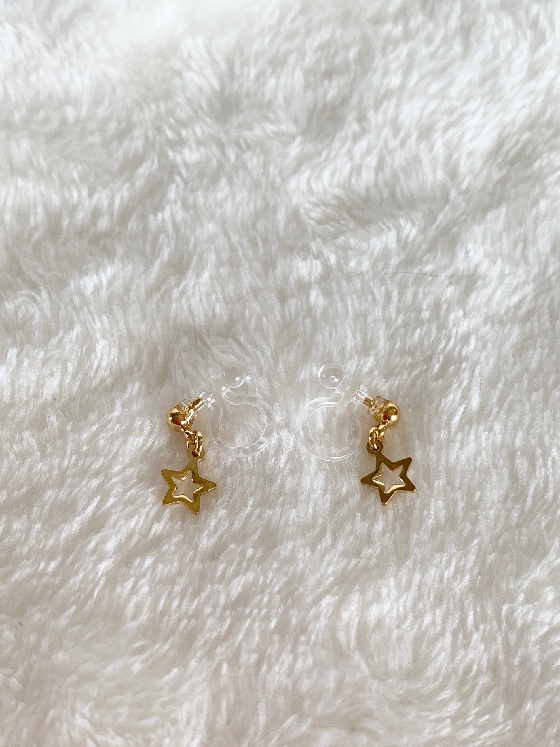 小さい星のパーツを使ったノンホールピアスです 星のパーツサイズ:約0.6cm 素材:星のパーツ 真鍮またはメッキ ノンホールピアス:樹脂 パーツ部分メッキ