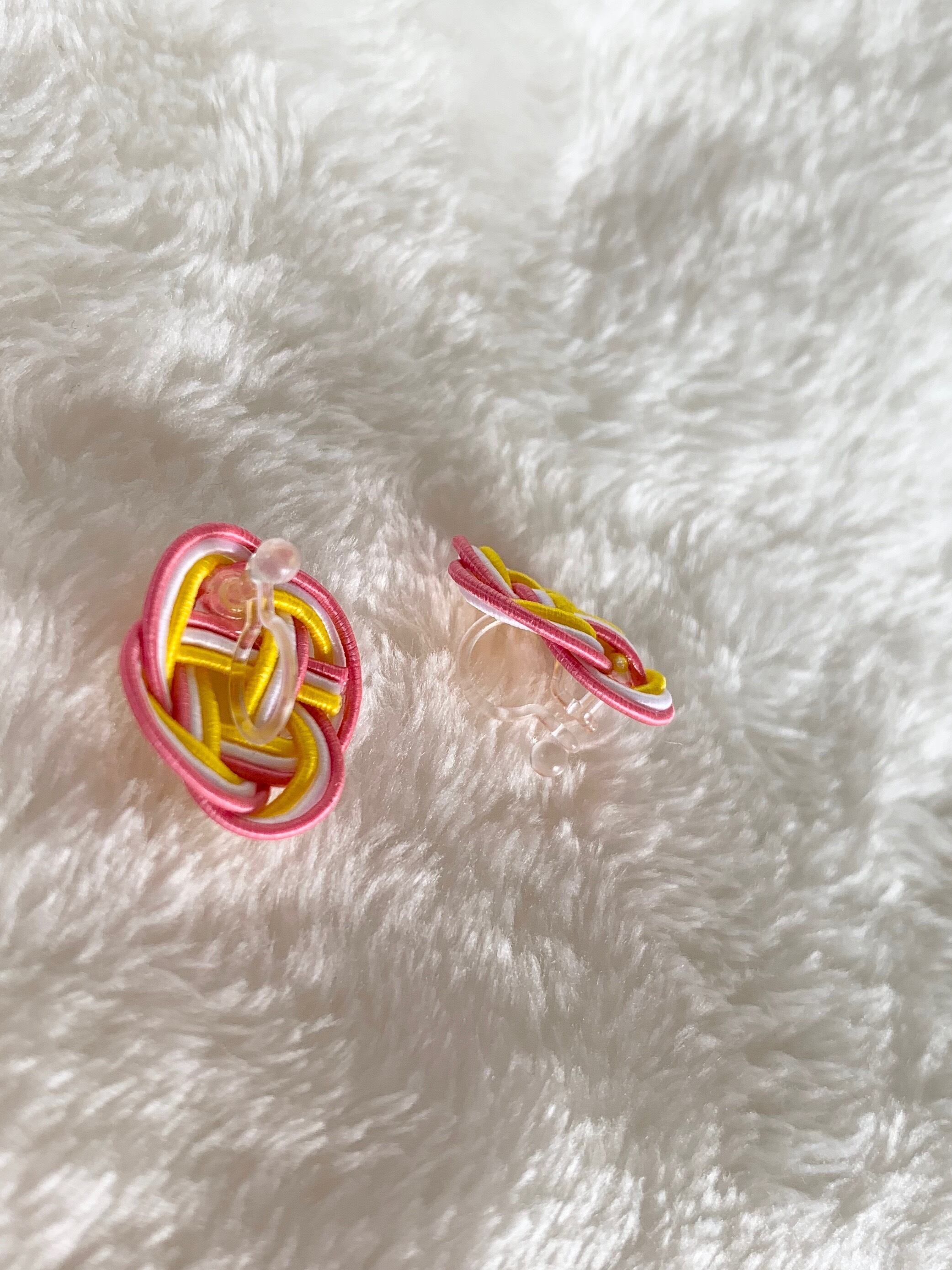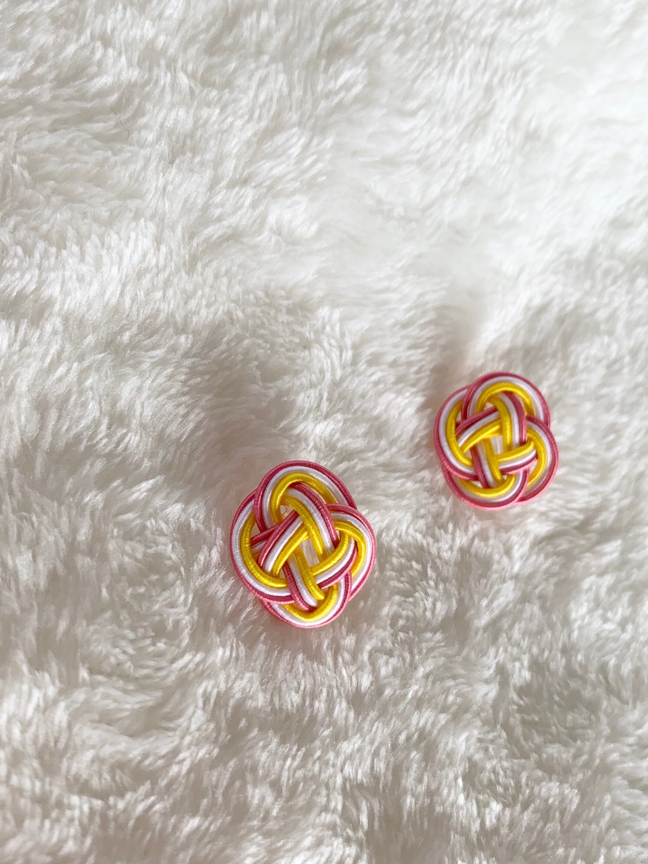 あわじ結び水引き ノンホールピアス ピンクetイエロー